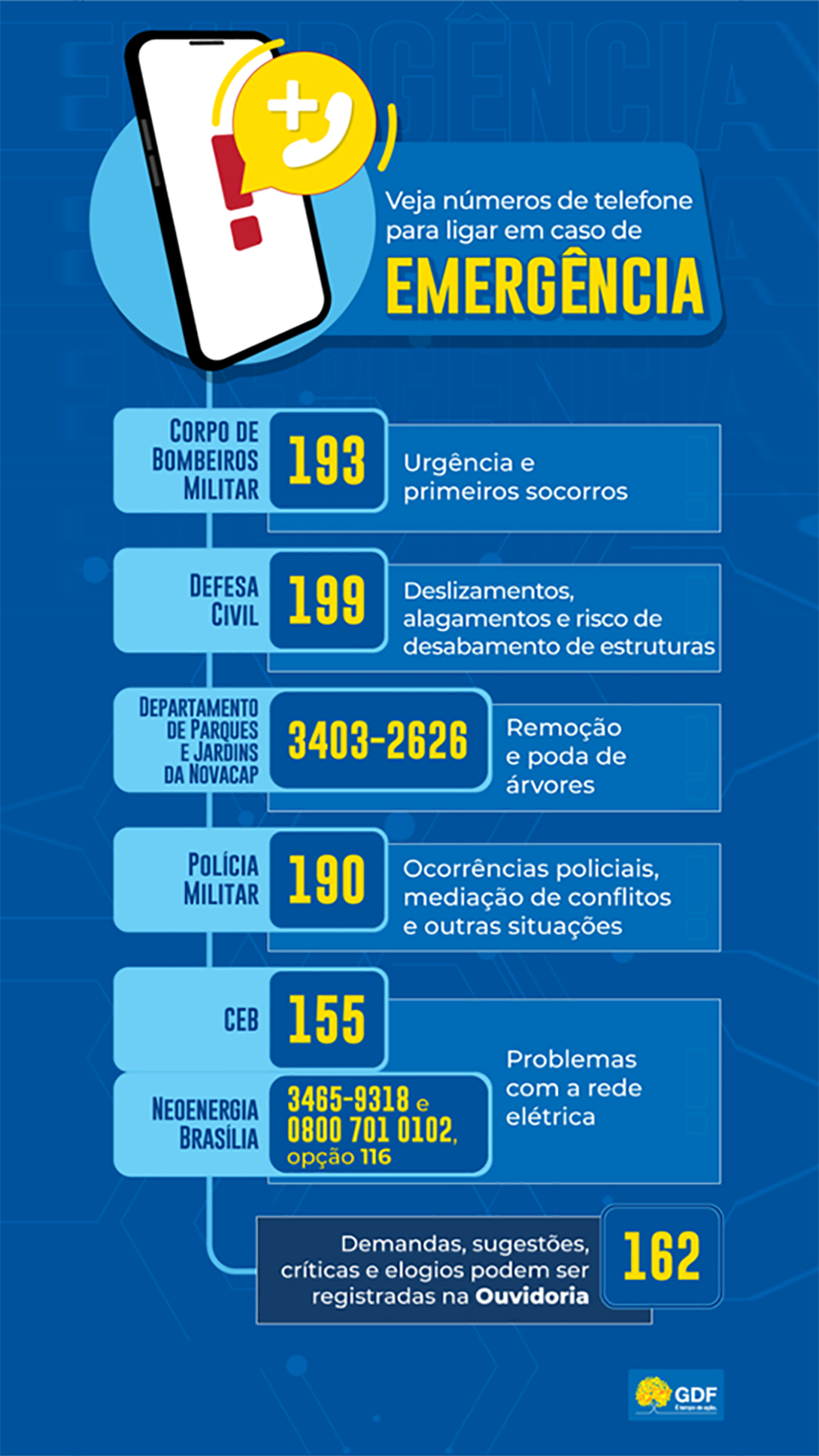 Se houver problemas com a rede elétrica, a Companhia Energética de Brasília (CEB) pode ser chamada pelo número 155 e a concessionária Neoenergia Brasília pelos telefones 3465-9318, que também é WhatsApp, ou 0800-701-0102, opção 116.
