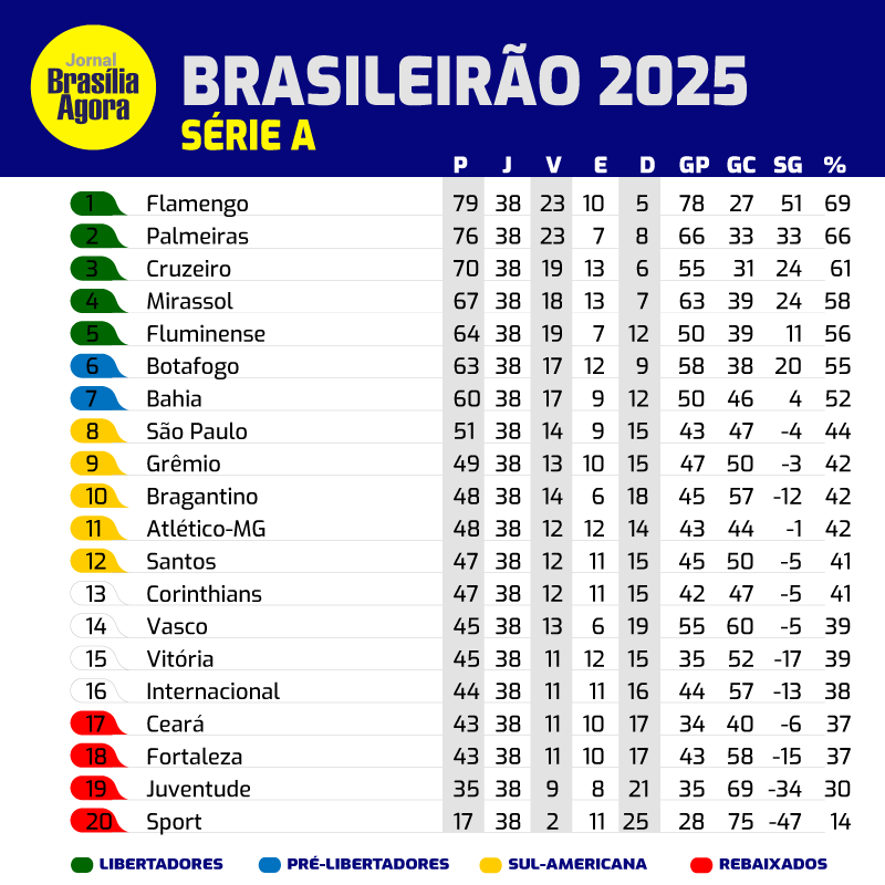 Sem categoria BRASILEIRÃO ► SÉRIE A 8 de dezembro, 2025 | Por: Redação As 20 equipes se enfrentam em turno e returno, ao fim das 38 rodadas, o time com maior números de ponto recebe o título, enquanto os 4 últimos são rabaixados para a Série B