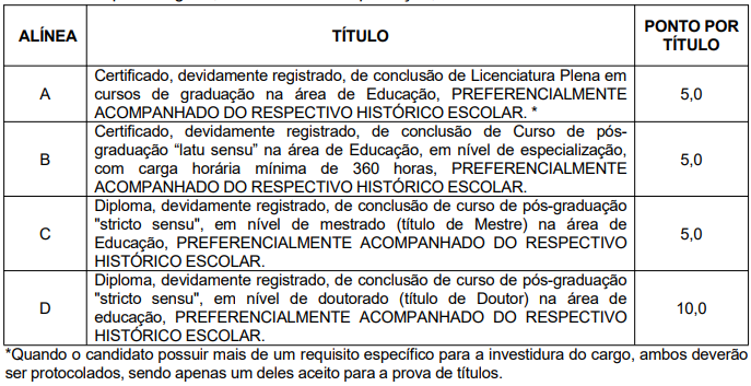A Prova de Títulos, de caráter apenas classificatório, será aplicada aos candidatos dos cargos de Professor e Professor de Educação Infantil com o objetivo de aferir o aperfeiçoamento acadêmico relativo ao cargo. Esta etapa valerá 20 pontos, ainda que a soma dos valores dos títulos apresentados seja superior a esse valor.